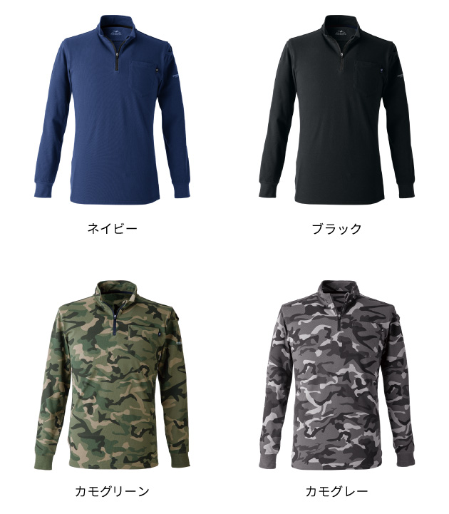 綿混素材特有の汗をよく吸い やわらかな肌触りとしっかりとした丈夫な素材感が人気のジップネック長袖Tシャツです。
