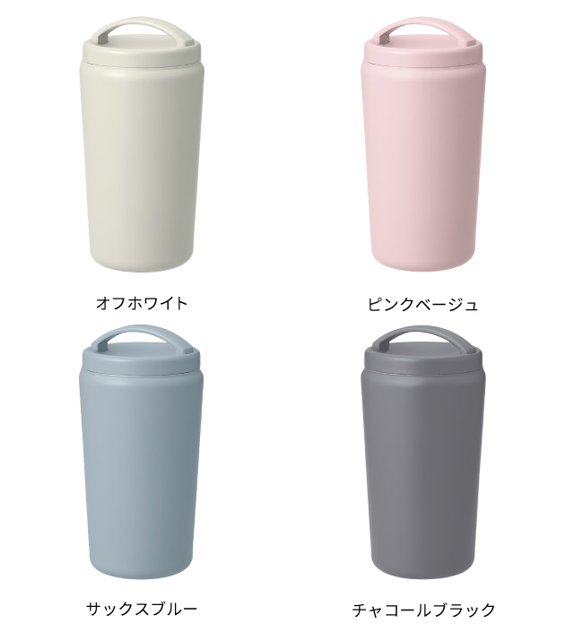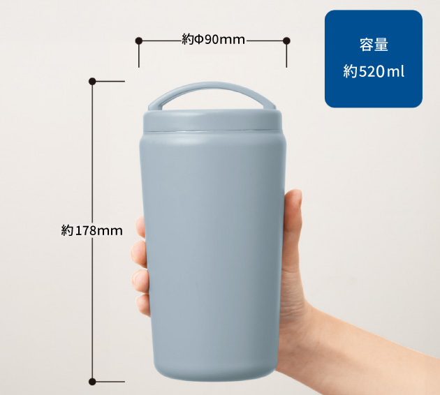 ハンドル付きで持ち運びがしやすく、現代のオフィスシーンにも馴染むような色合いのタンブラーです。