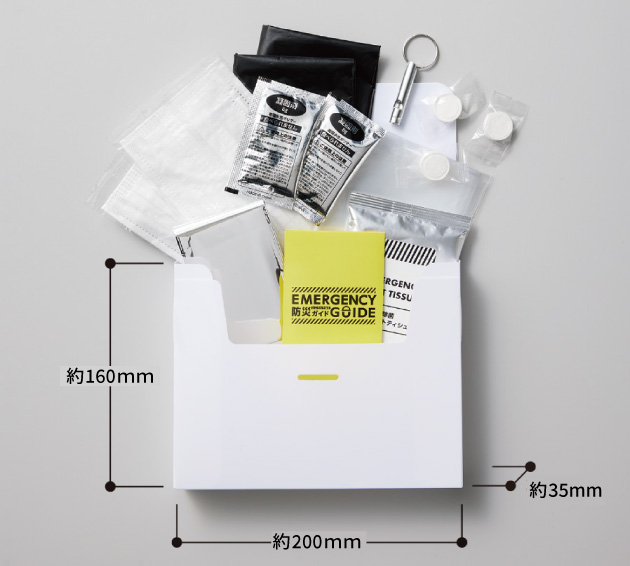 ケース/個包装マスク×2pcs/個包装圧縮タオル(薄手)×3pcs/アルミホイッスル・アルミブランケット/非常用携帯トイレセット×2pc/除菌ウェットティシュ/ポリ袋×5pcs/防災ガイド