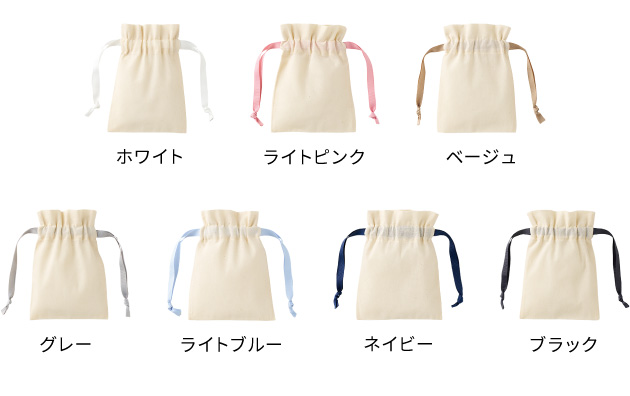 7色展開のカラーリボンがポイントのコットン巾着です。